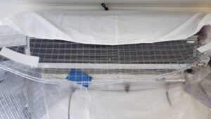 お掃除機能付きエアコンは、フィルターを自動で動かす「お掃除ユニット」取り外さないと本体の奥まで洗浄ができないため、そのユニットの分解、および洗浄後の取り付けには通常のエアコンクリーニングに比べて作業時間が多くかかります。